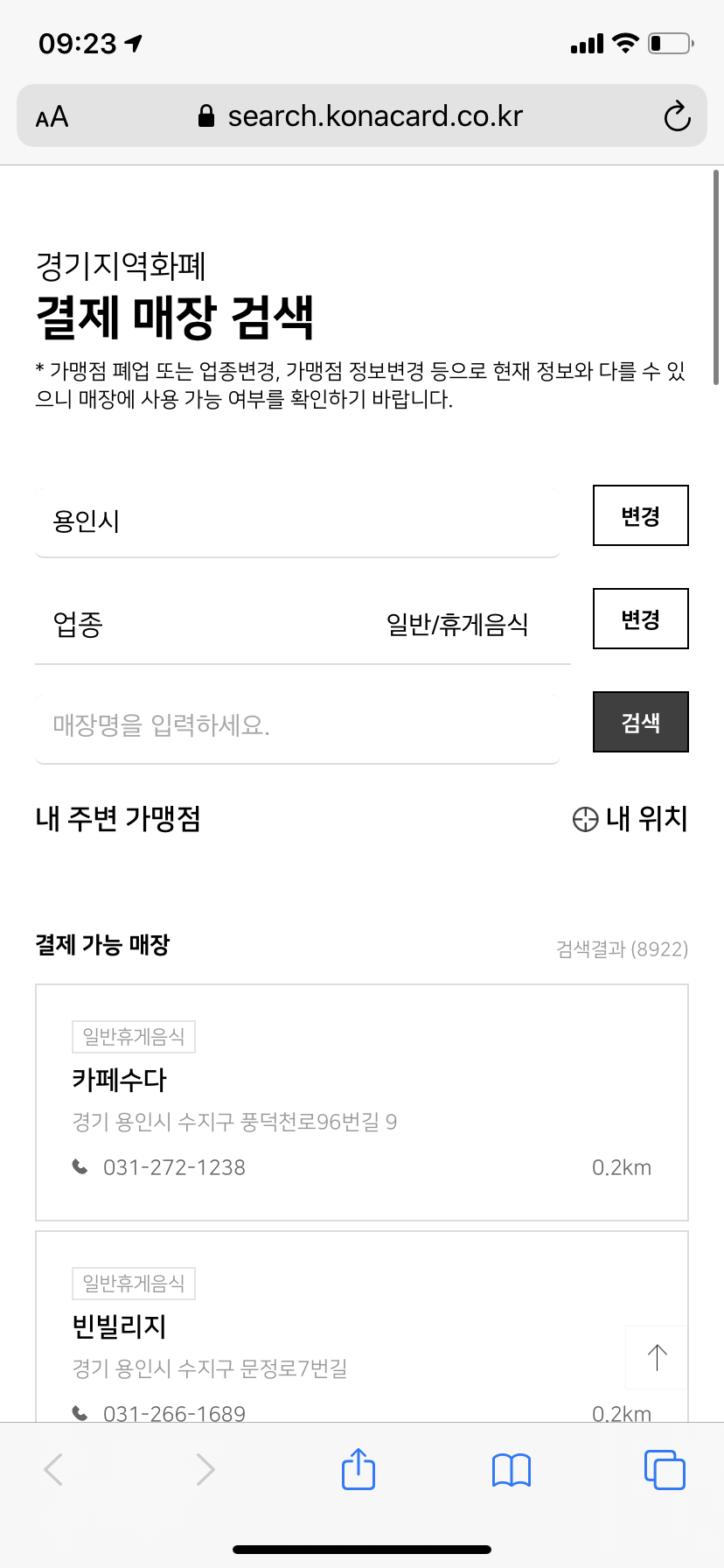 그런데 아래 주소에서 바로 찾을 수 있다!!! 용인시뿐만 아니라 경기도의 모든 시의 지역화폐 가맹점을 검색할 수 있다.