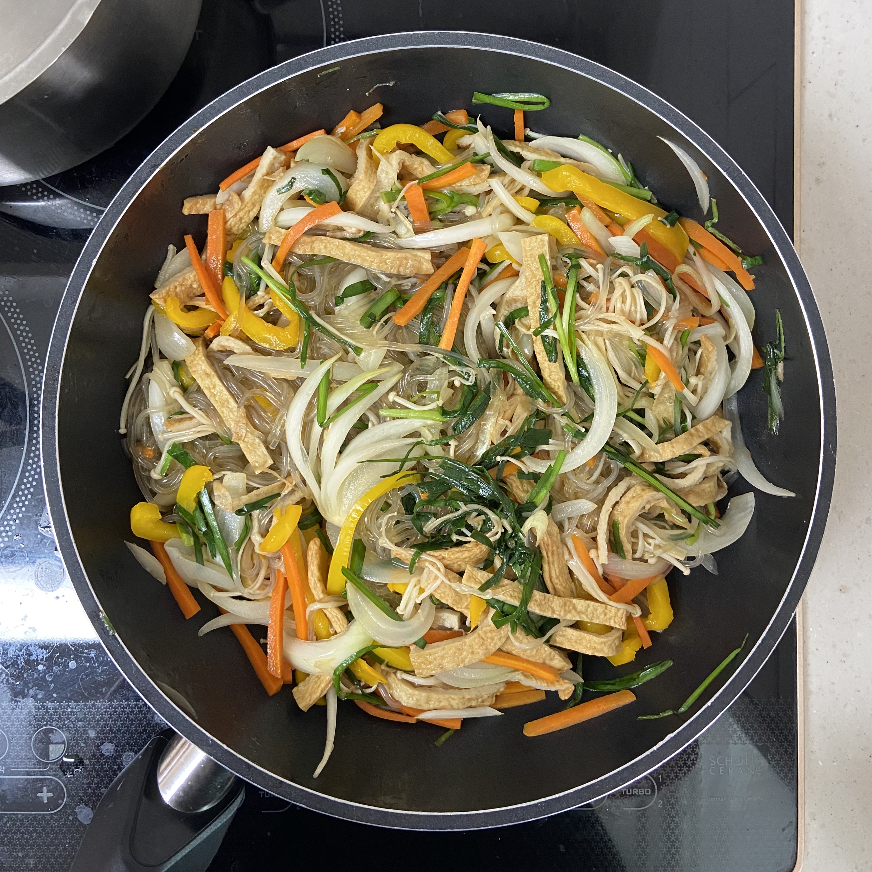양념은 양조간장에 흑설탕을 넣어 만든다. 어묵을 넣었기 때문에 양념을 많이 하지 않아도 된다. 양념을 넣어 당면을 후라이팬에 살짝 볶아주면 당면 색이 잘 든다. 볶은 당면에 미리 볶아둔 재료 넣어 잘 섞어주면 잡채가 완성 된다. 섞으면서 나머지 양념을 넣어 간을 맞춰준다.반응형'조리예' 카테고리의 다른 글