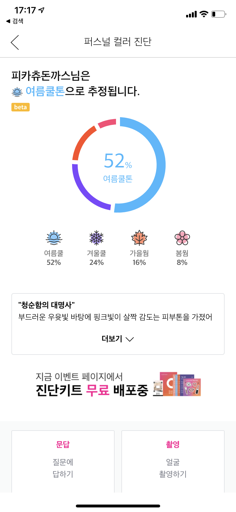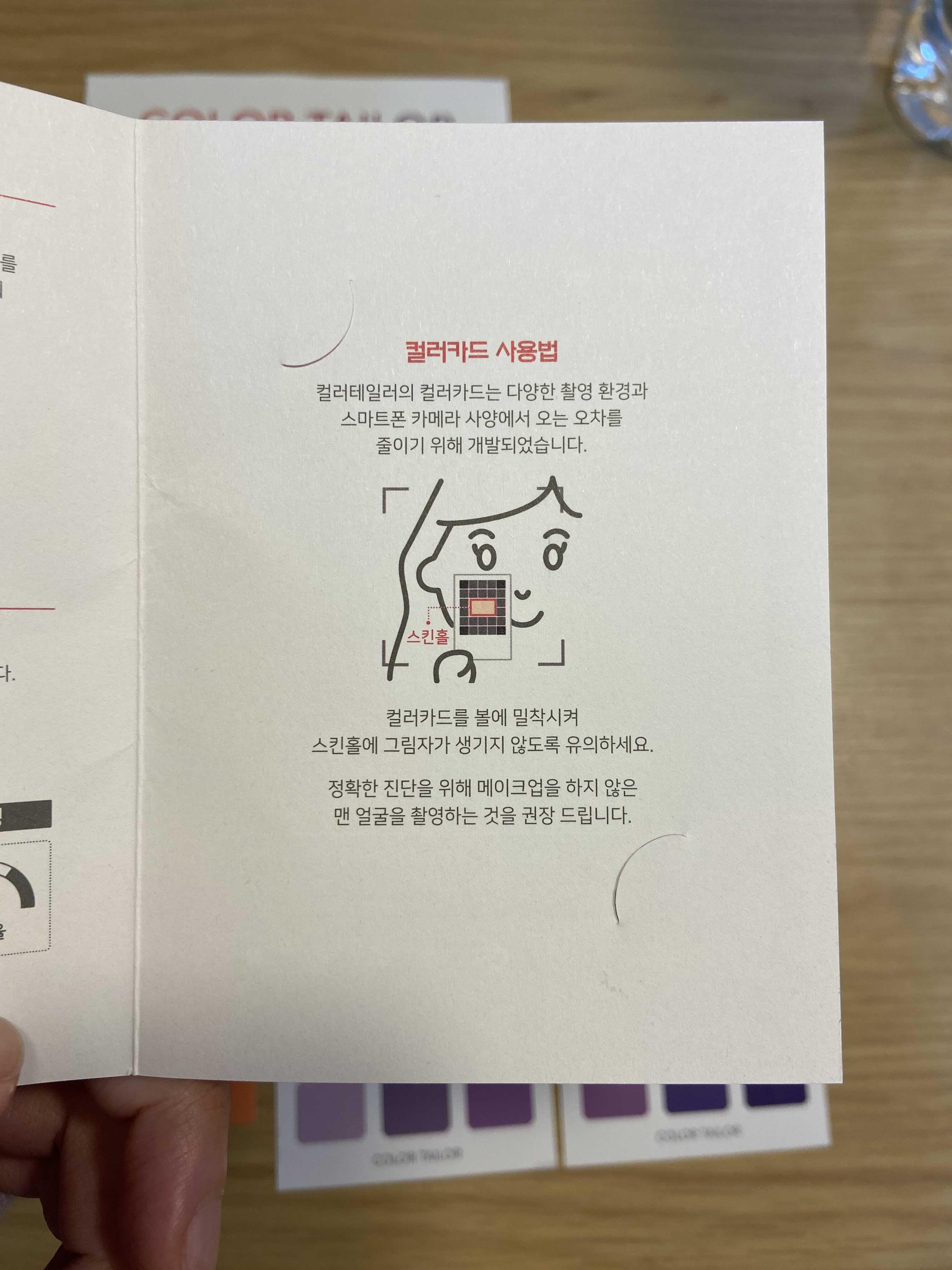 여러가지 스킨색이 프린트된 종이인데 가운데 구멍이 뚫려있다. 앱에서 컬러 카드와 얼굴 가이드에 맞춰 사진을 찍으면 퍼스널 컬러 진단을 해준다. 더 정확한 세부톤을 알려면 오프라인 진단이 필요하겠지만 진단 키드 받아서 가볍게 해보는 것도 재미있을 것 같다.