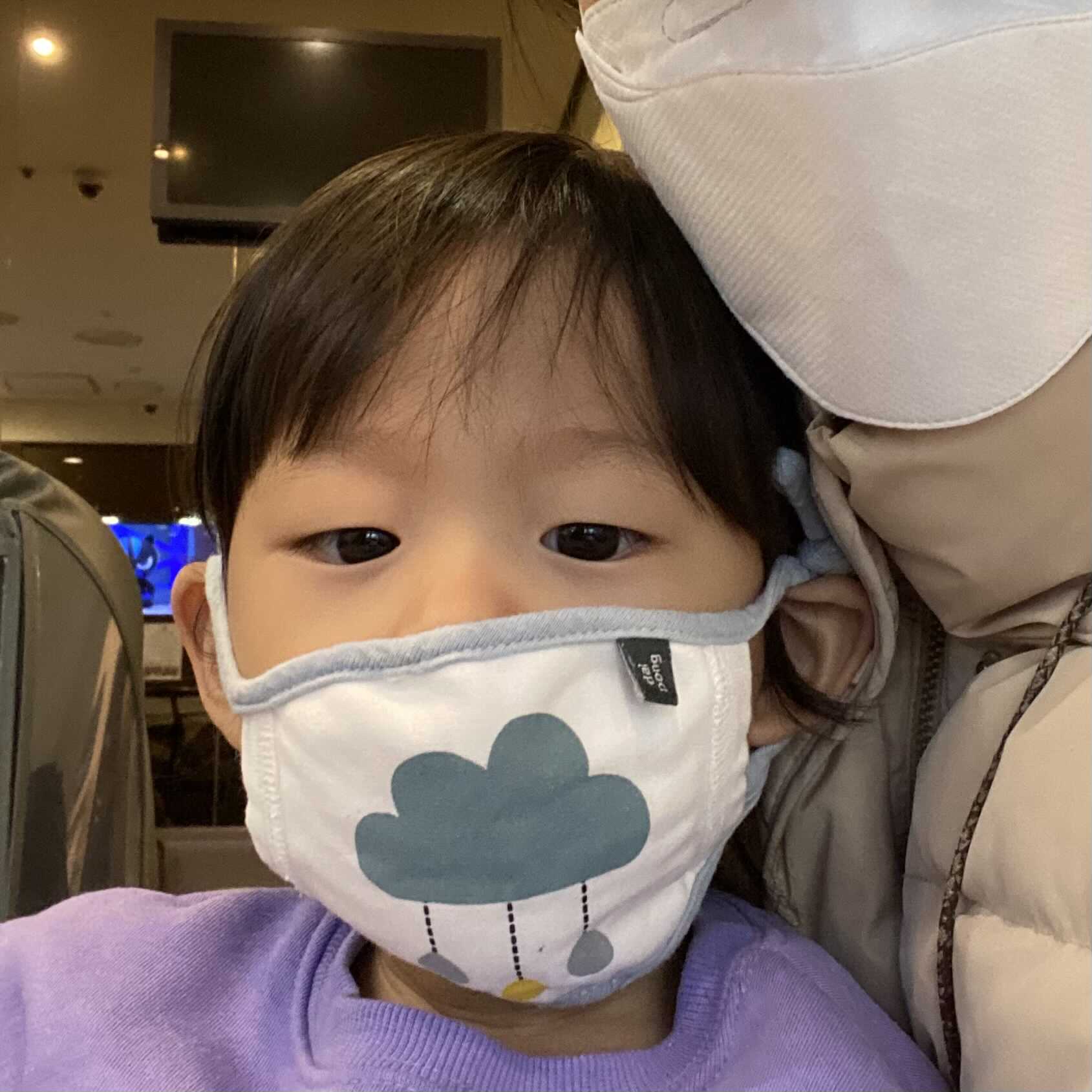 아직 말귀도 못 알아듣고 훈육도 안되는 애들이라 마스크를 안 써서 유모차에 방풍 커버 씌우고 다니는데 오늘은 TV에 정신이 팔려서 그런가 마스크를 씌워주니 가만히 있었다.