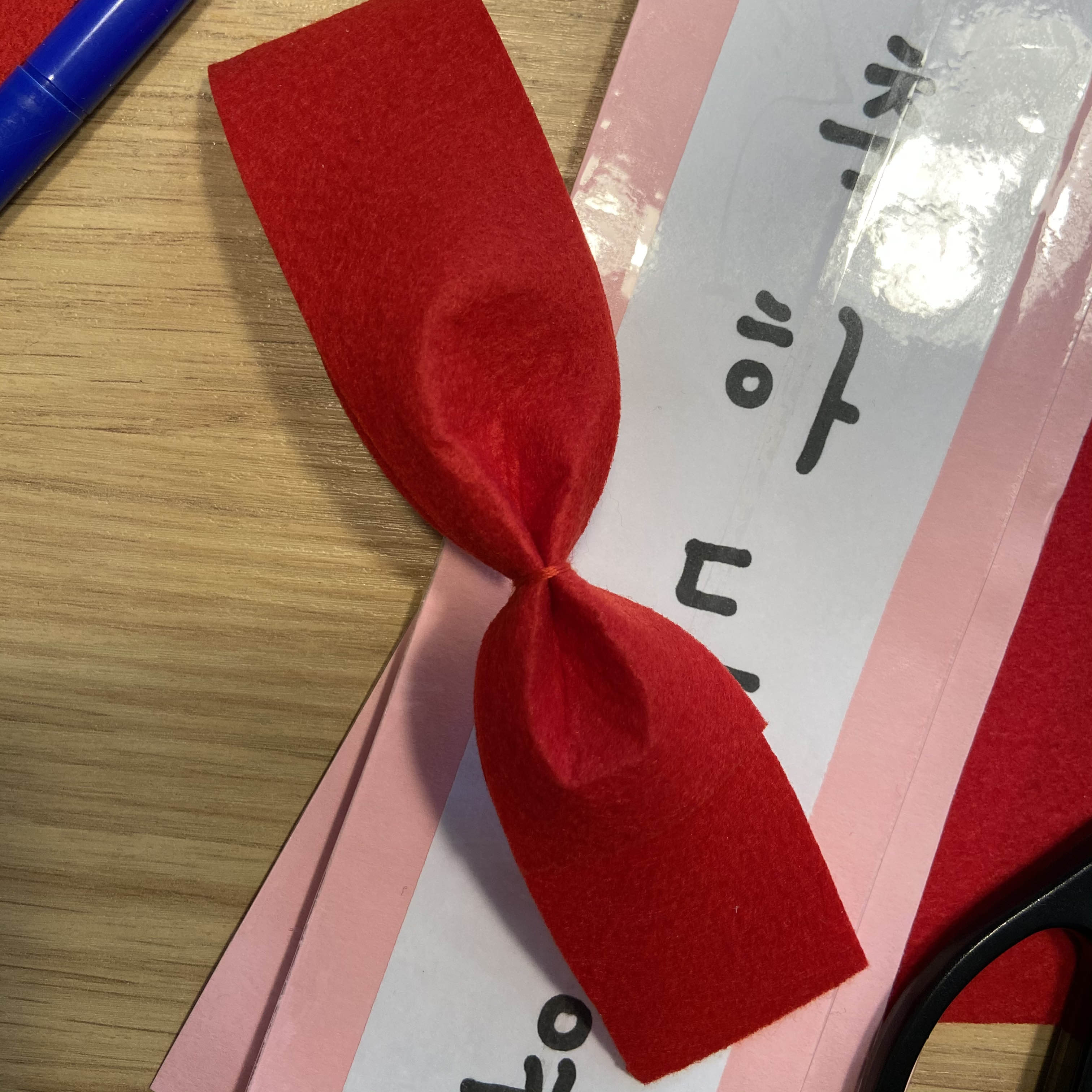 검색해보니 판매해도 될만큼 예쁘게 잘 만드시기도 하던데 일단 우리집에는 프린트도 없어서 손글씨로 썼다. 붓펜을 산다는 것도 깜빡했는데 다행히 집에 굵은 마카펜이 있어서 그걸로 썼다. A4 용지를 잘라 글씨를 쓰고 색상지를 덧댔다. 모닝글로리서 시트지를 마단위로 판다고 해서 그냥 투명 박스 테이프로 마무리 해주었다. 리본은 펠트지(부직포)로 만들었다. 길게 잘라 아래 위로 접어서 실로 묶은 리본 반쪽을 두개 만들어서 겹친 다음 얇은 펠트지로 묶어 글루건으로 고정해주었다.