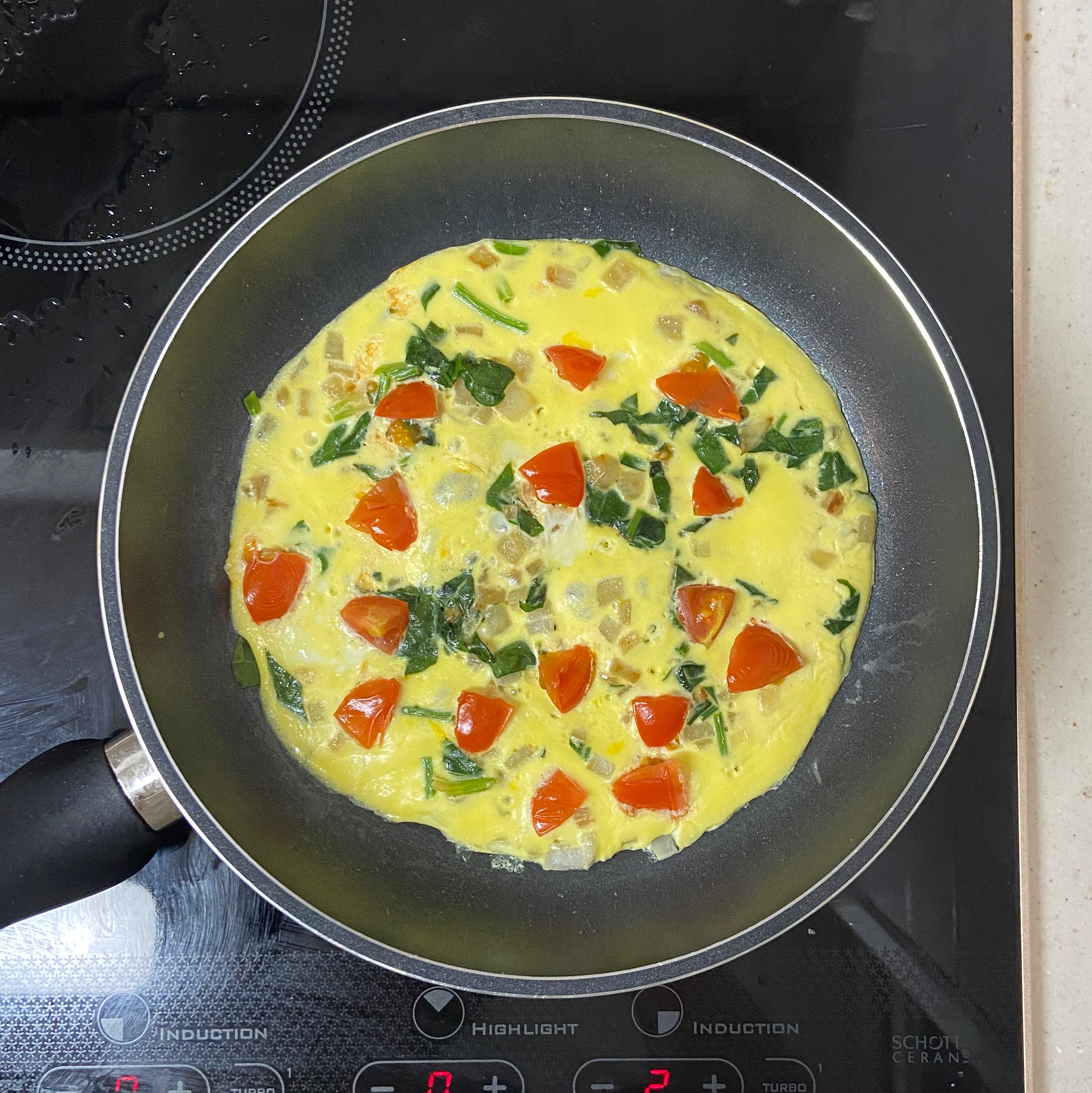 인스타에서 많이 보이는 아기 반찬(또는 간식)이라 해줘봤다. 달걀 두개에 우유를 넣고 저어주다가 팬에 펴고 그 위에 토마토, 양파, 시금치를 올린다. 뚜껑을 덮고 약한 불로 익힌다. 아기님들이 좋아해서 반착으로도 먹고 간식으로도 잘 먹었으나 조리 시간이 비교적 오래 걸려서 요즘은 안 해준다는..