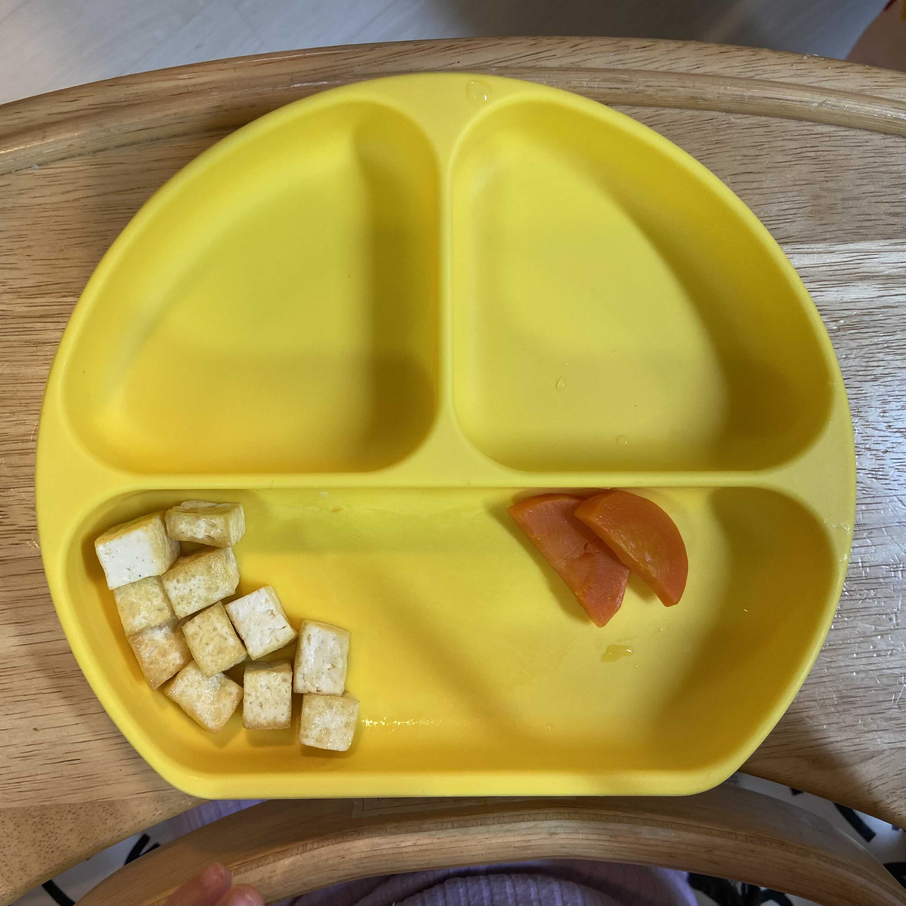 두부는 기름만 둘러서 굽는다. 그럼 포크로 찍거나 손으로 잡아도 부숴지지 않을만큼 단단해진다. 당근을 삶거나 쪄 준다. 당근을 삶으면 달아져서 애들이 정말 정말 잘 먹는다. 단 당근을 너무 익히면 포크로 잘 찍히지 않고 조금만 덜 익혀도 먹기에 너무 딱딱하기 때문에 적절하게 익히는 것이 중요하다.