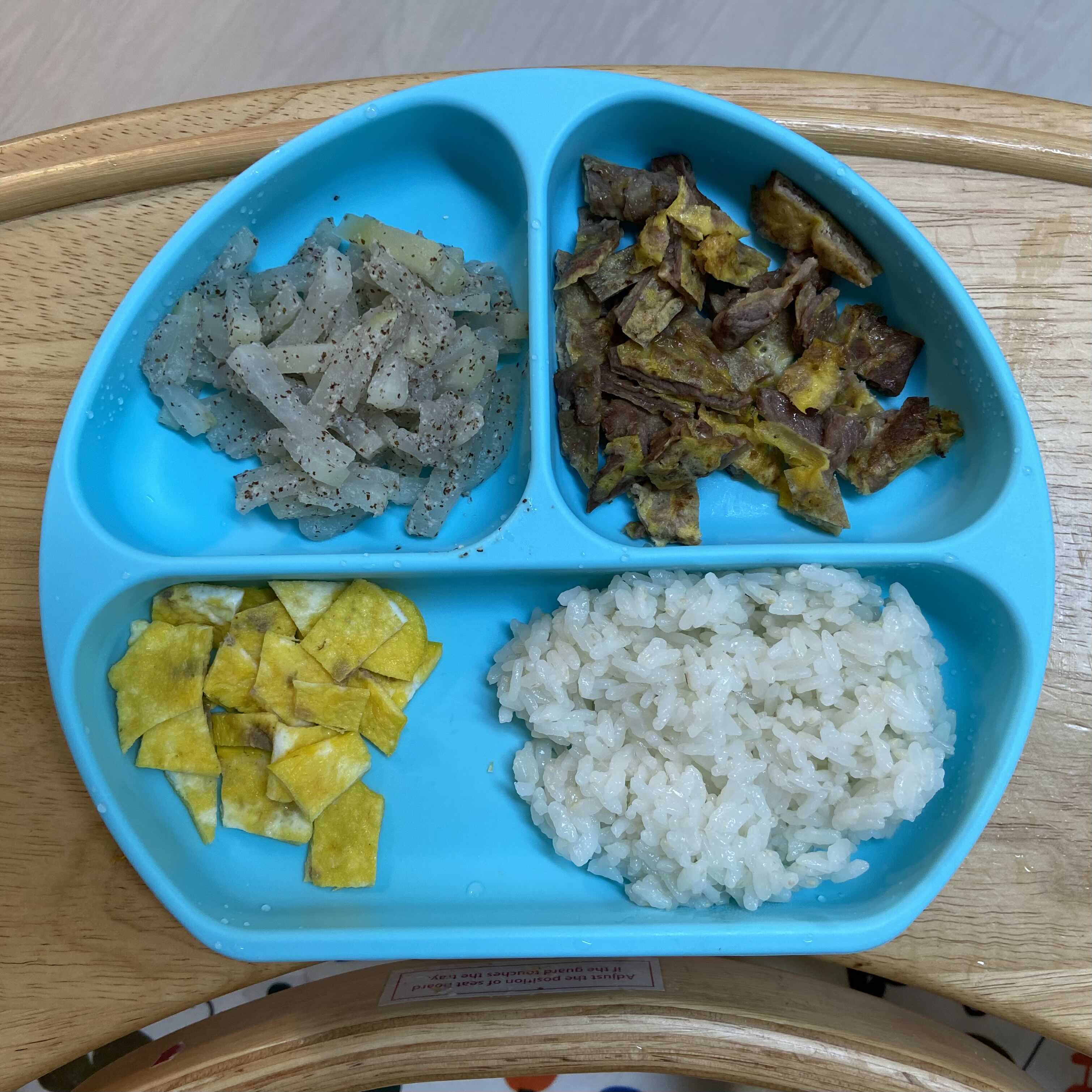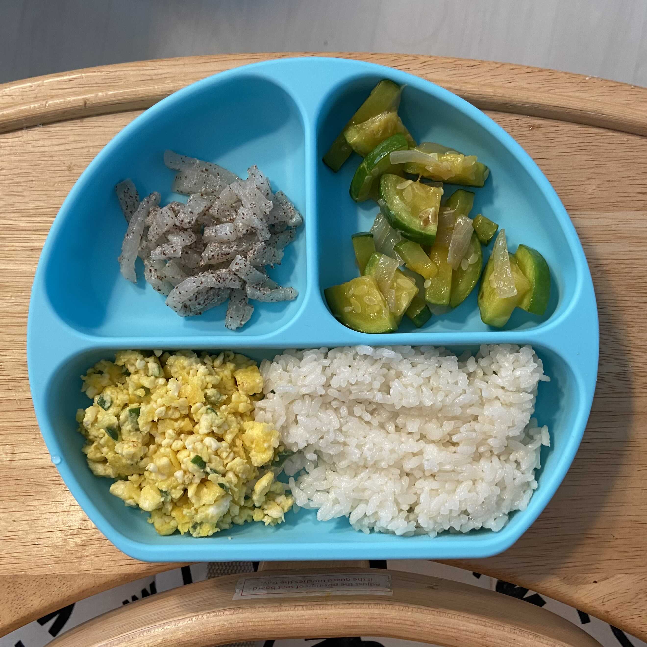 사실 계란 후라이를 하려다가 실패해서 스크램블이 되었는데.. 비슷하겠지 하고 줬는데 숟가락질을 잘 하면 모를까 이걸 포크나 손으로 먹으니 다 떨어지고 완전 난리도 아니었다. 숟가락질이 서툰 아기에게 스크램블은 절대 비추다. 애호박 볶음은 양파를 넣었더니 설탕 없이도 달달하게 되어 잘 먹었다.