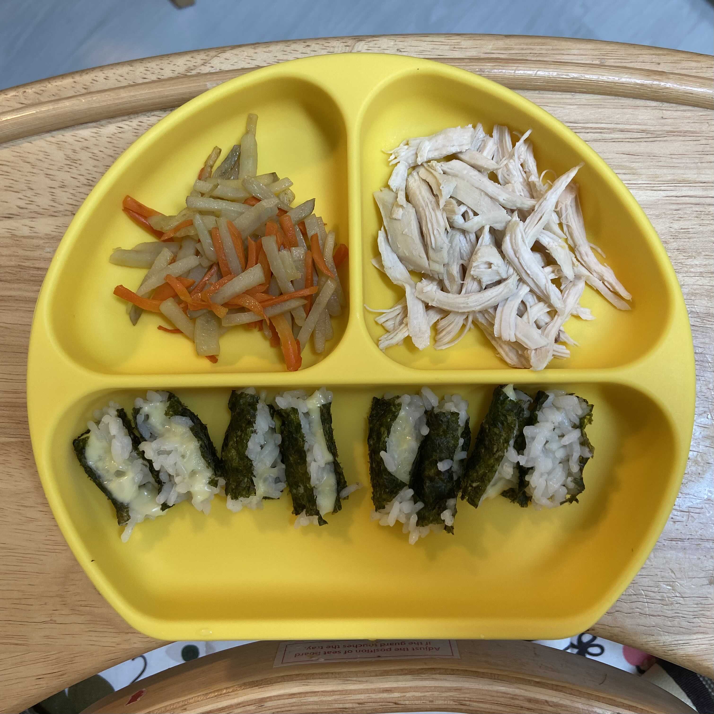 닭고기는 삶아서 찢어 주기만 하면 되기 때문에 준비하기가 정말 간편하다. 삶으면 나오는 육수는 죽이나 국 등으로 활용하기에도 좋다. 치즈 김밥은 어른 김밥처럼 거창한게 아니라 그냥 아기 치즈 넣고 밥을 김에 싼 것이다. 김을 싸서 주면 손이 찐득해지는 것을 막을 수 있다. 김은 조미가 안된 김을 쓰는 게 좋다. 돌 쯤에는 김 식감이 이상해서 그랬는지 뱉어내더니 요즘엔 매우 잘 먹는다.