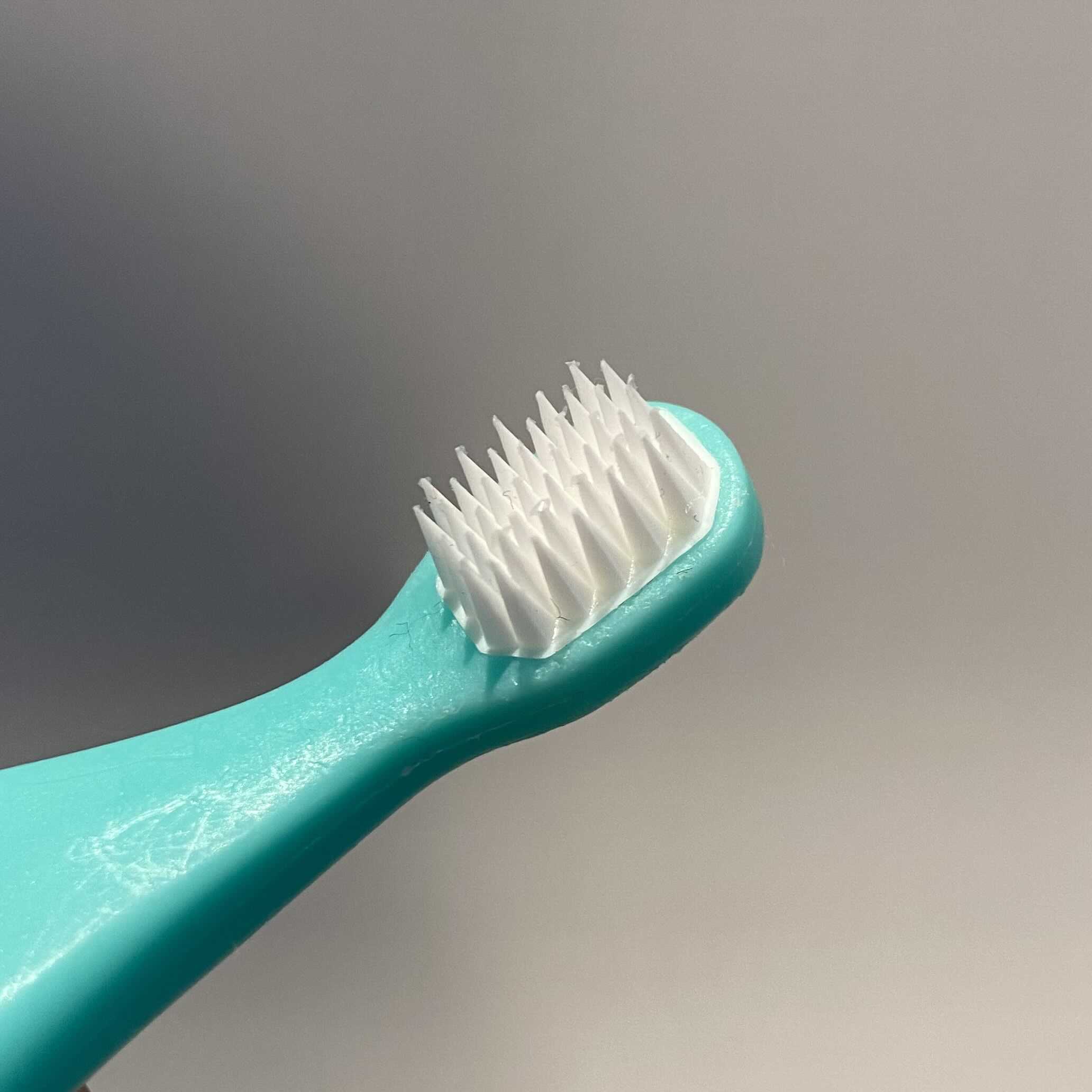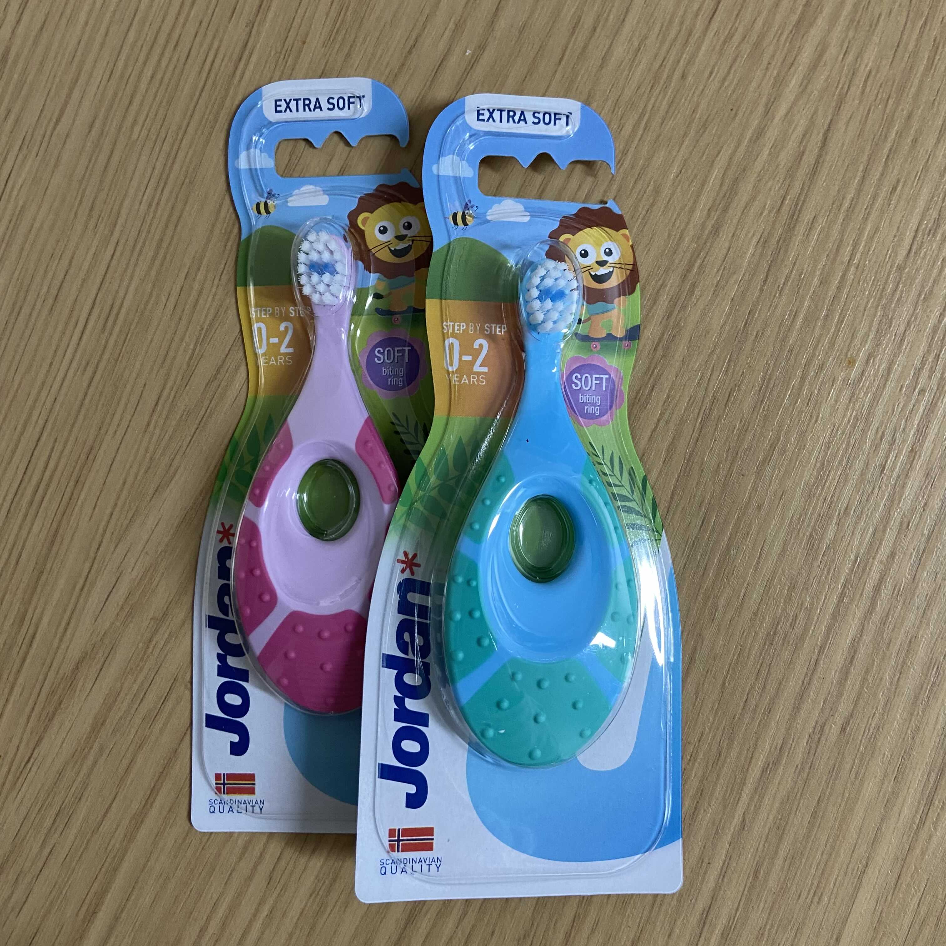 바로 아기들이 혼자서 하기에는 무리라는 것이다. 정확히 말하면 양치 하라고 쥐어줬더니 돌아다니면서 하다가 넘어져서 목구멍이 찔려 아기님이 펑펑 운적이 있었다.. 😭😭 이건 아예 큰 아이들이 쓰거나 아니면 전적으로 엄마 아빠가 양치질을 해주는 용으로 써야 한다. 그래서 둥근 손잡이 칫솔을 찾다가 최종적으로 나도 즐겨 쓰는 조르단에서 나온 유아용 칫솔에 정착했다!!! 가격도 하나에 2천원 정도로 괜찮은 편이다. 유아 칫솔은 꽤 비싼편인데 아기님들은 칫솔을 물고 뜯기 때문에 어른보다 자주 바꿔줘야 한다. 칫솔 모가 난 쪽으로 이를 닦아야 하는데 모가 없는 쪽으로 닦는 경우도 많아서 칫솔 머리에 잇자국이 정말 많이 남고 모도 뜯어버린다.. 🤦🏻♀️ 참고로 칫솔 머리에 360도로 모가 있는 칫솔도 있는데 개당 6천원 정도 한다. 아주 고렴이.. 난 그냥 2천원 정도에 타협 보고 한달 주기로 바꿔주기로 했다.