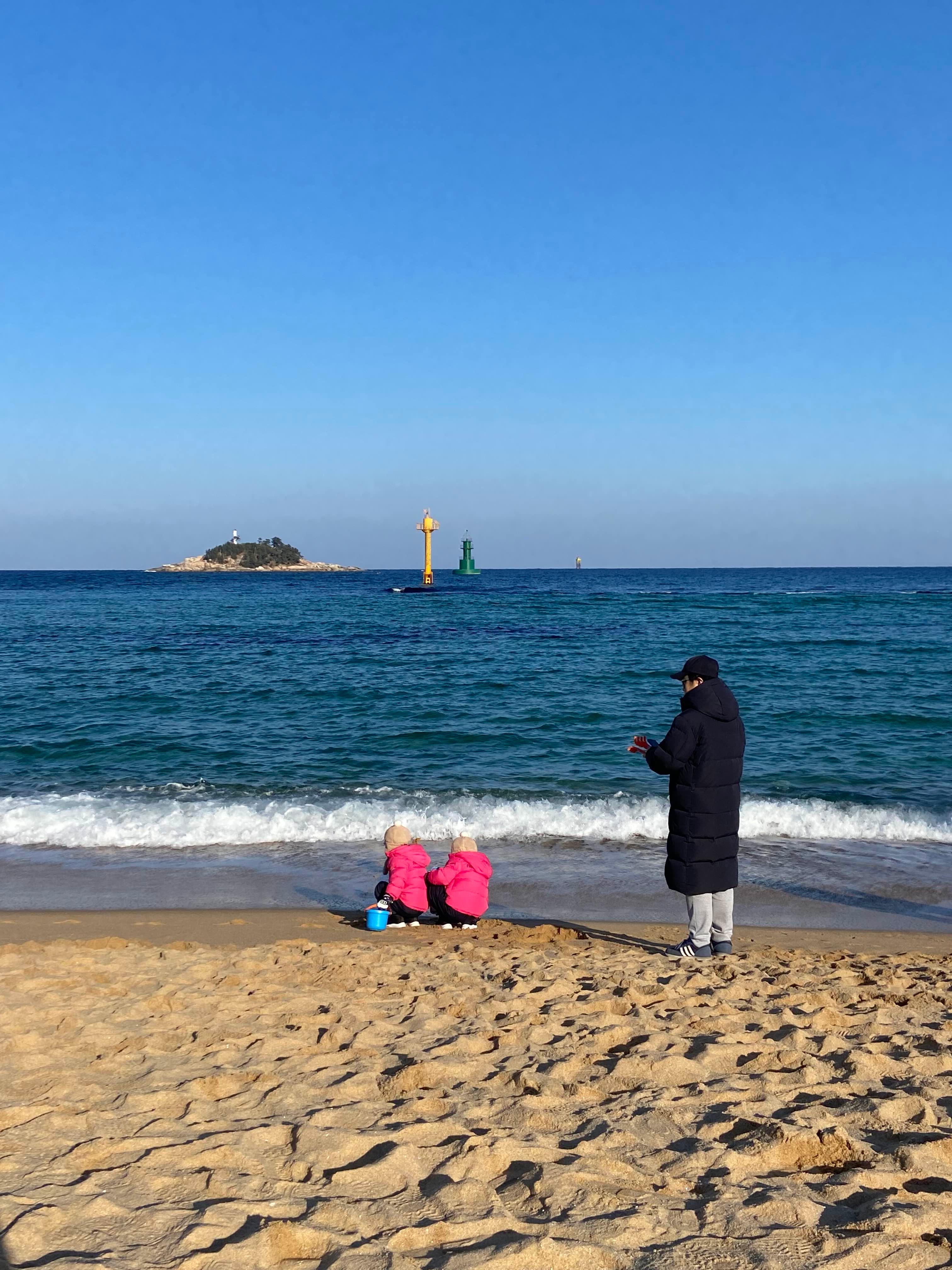 겨울 바다에서도 빠질 수 없는 모래 놀이..