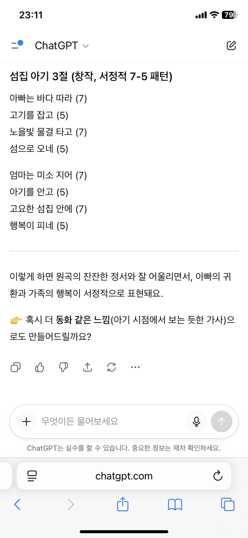 2절까지 다 부르면 애들이 뿌엥! 하고 안기면서 잘 줄 알았는데 이놈들이 아빠는 어디 갔냐고 한다. 7살이 되더니 부쩍 논리적이 된 느낌.. 그래서 gpt에게 아빠가 고기 잡고 돌아오는 내용으로 3절을 만들어달라고 했다.